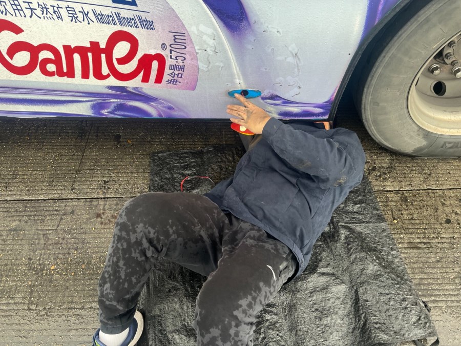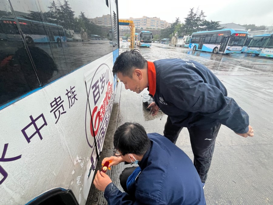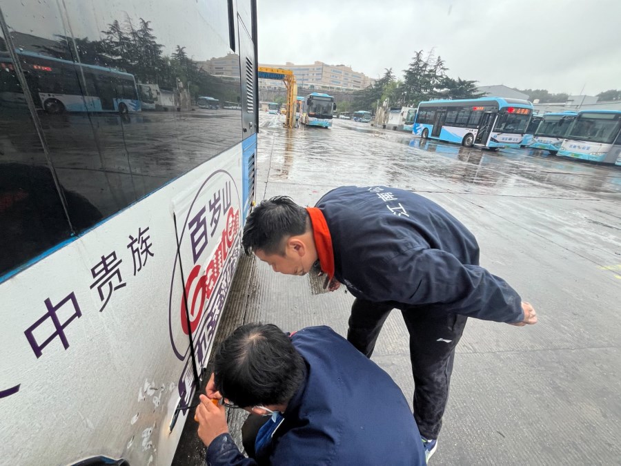 机电工陈锐,没有丝毫犹豫,他提起工具,一头扎进了滂沱大雨中。为了不耽误驾驶员后续的年检和运营时间,他争分夺秒。场地积水严重,他顺手找来一块黑色塑料袋垫在湿漉漉的地上,随即俯身,半个身子毅然探入了车底。