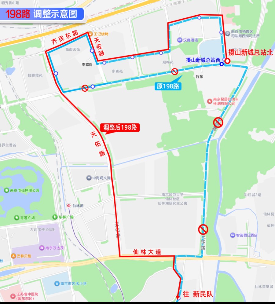 * 走向调整:线路南段自“仙林大道经天路”路口起,拟沿仙林大道至终点站“元化路”起讫(返程路段相同)。