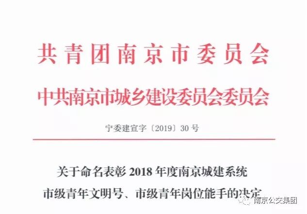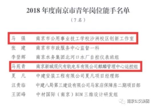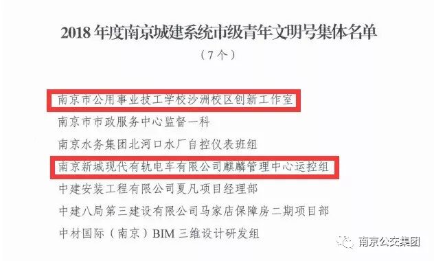 南京公交集团所属场站公司公用事业技工学校沙洲校区创新工作室、现代有轨电车公司麒麟中心运控组被共青团南京市委员会和中共南京市城乡建设委员会委员会授予市级“青年文明号”集体的称号。